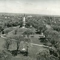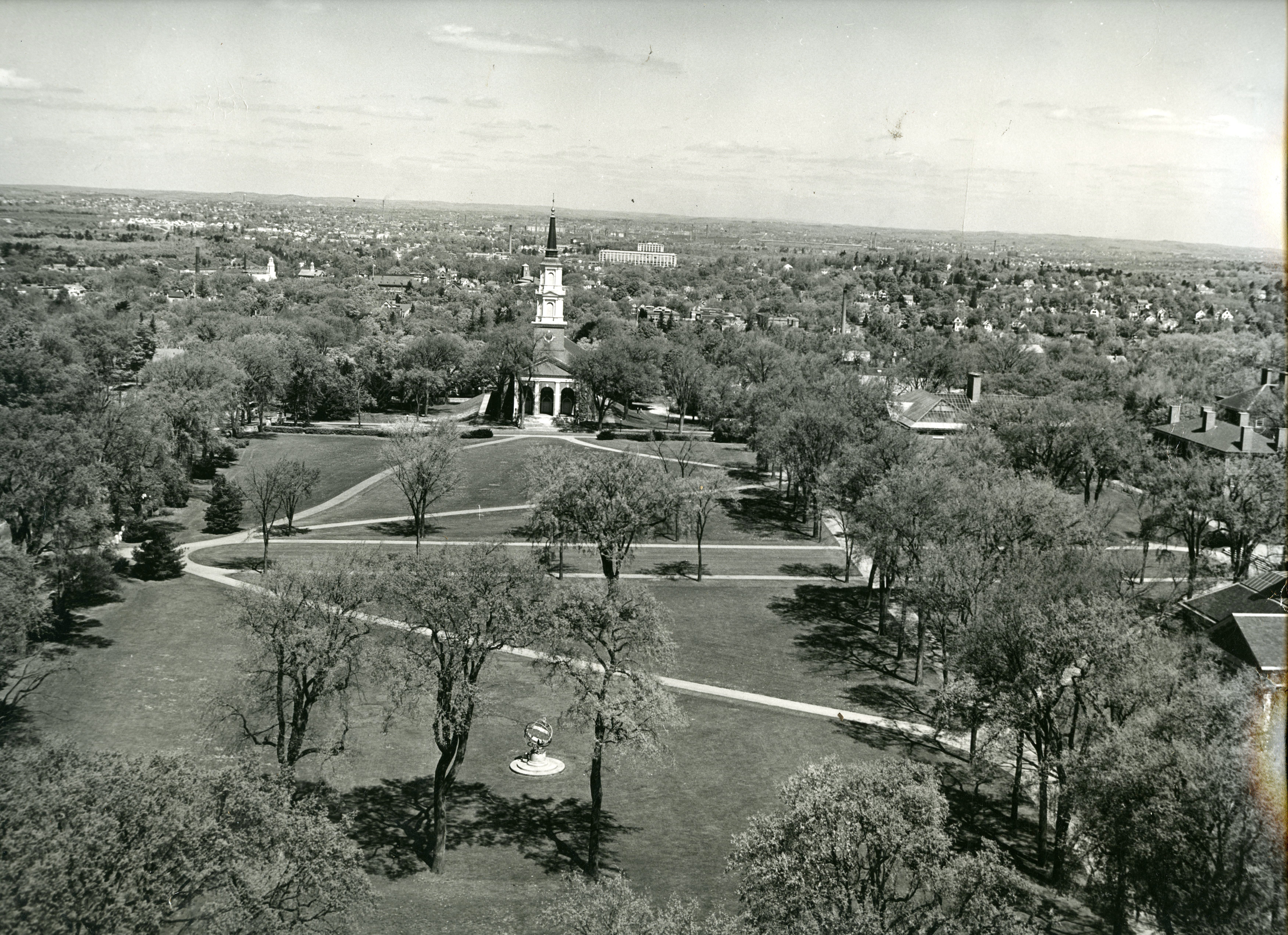 Aerial views are always popular as it provides the thrill of being airborne. Older views help mark the locations of long gone buildings. Newer ones can provide a map for negotiating a large campus such as ours. This is a taken from the Bell Tower looking north toward the chapel, the Merrimack River and the City of Lawrence. The Armillary Sphere in the foreground has been moved from its original location in front of Samuel Phillips Hall to in front of the library.