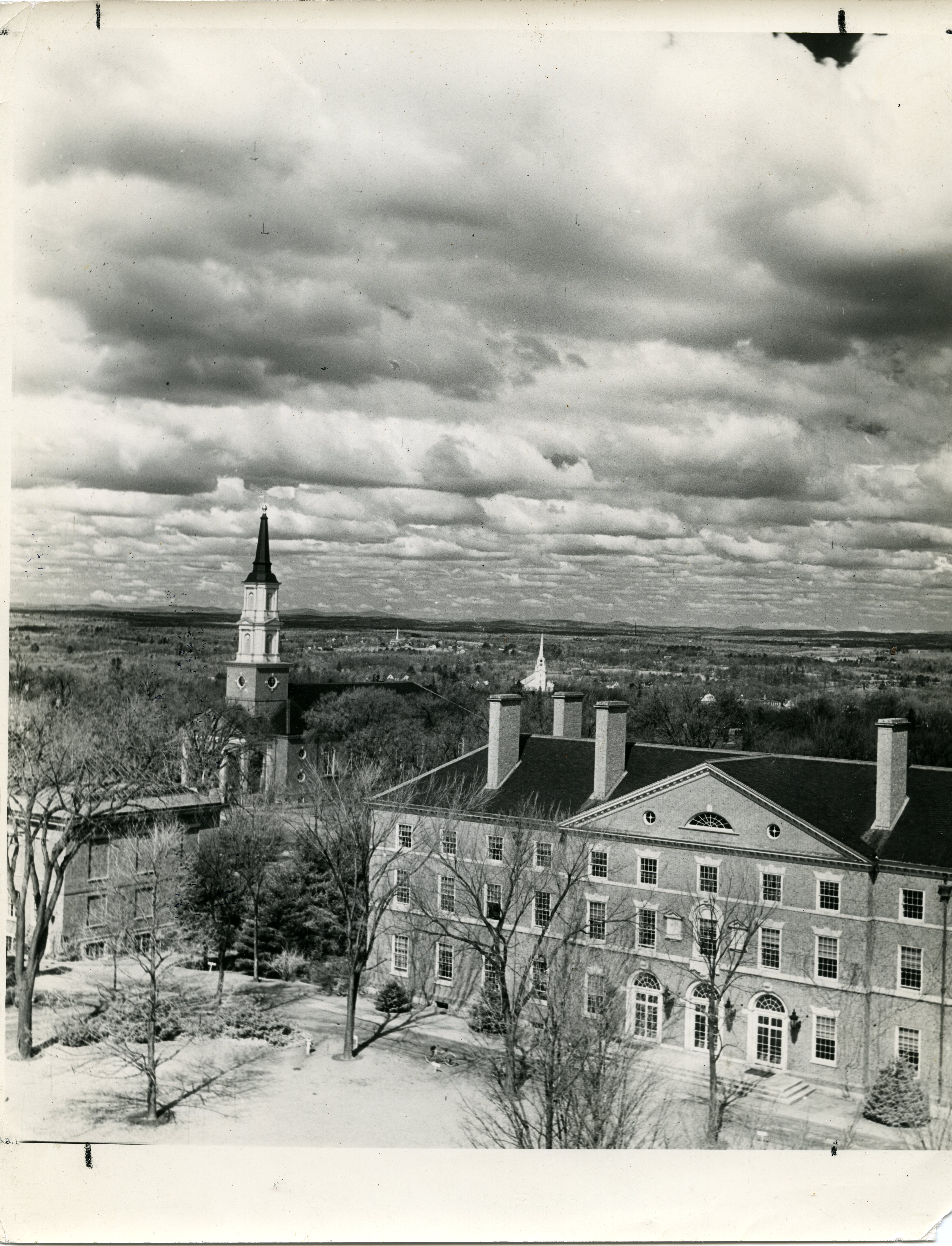 Aerial views are always popular as it provides the thrill of being airborne. Older views help mark the locations of long gone buildings. Newer ones can provide a map for negotiating a large campus such as ours. This is a view from the Samuel Phillips Hall roof looking Northwest toward George Washington Hall, Cochran Chapel and South Church. Parson Samuel Phillips, the father and grandfather of the two Samuels who founded the Academy, was the first minister of that church.
