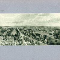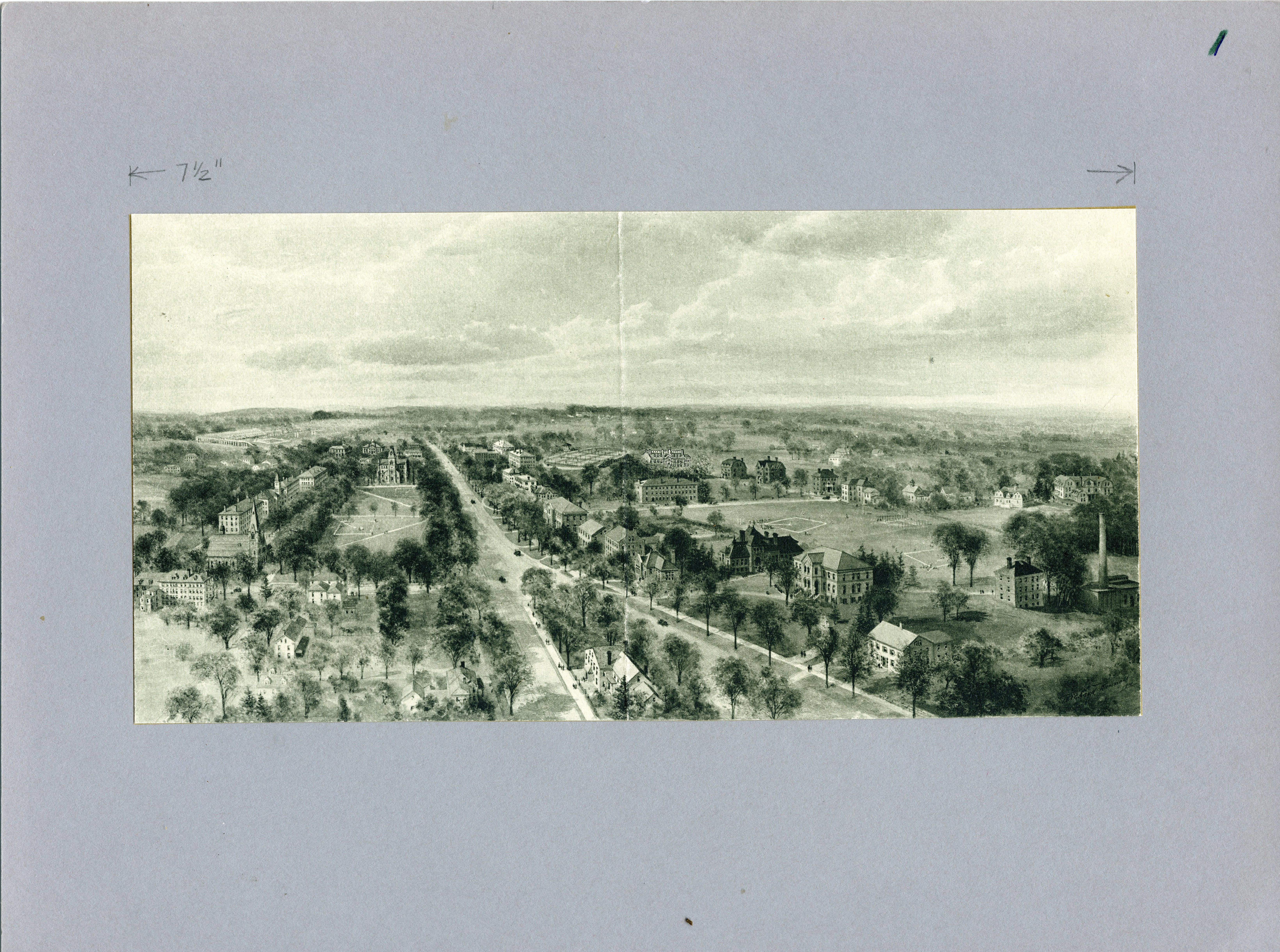 Aerial views are always popular as it provides the thrill of being airborne. Older views help mark the locations of long gone buildings. Newer ones can provide a map for negotiating a large campus such as ours. This etching is a 1911 done from a view reportedly from an airplane looking south toward the campus from over the town center. This is a good representation of what the campus was like as Thomas Cochran saw it before he brought about the great changes in the twenties and thirties.
