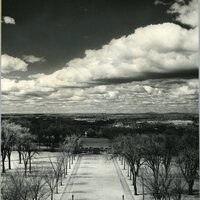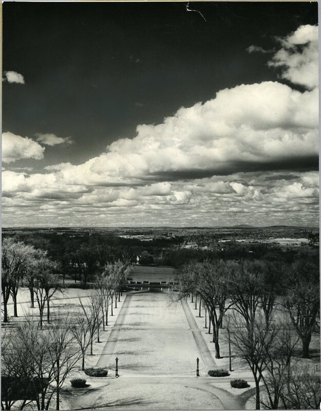 Aerial views are always popular as it provides the thrill of being airborne. Older views help mark the locations of long gone buildings. Newer ones can provide a map for negotiating a large campus such as ours. Taken from the roof of Samuel Phillips looking west along The Vista. The Armillary Sphere, which now resides in front of the library used to sit on the lawn in front of SamPhil right at the grass edge near the stairs between the lamp posts. It blocked the view, so it had to go.