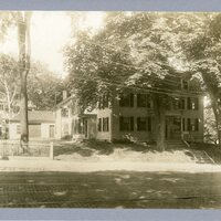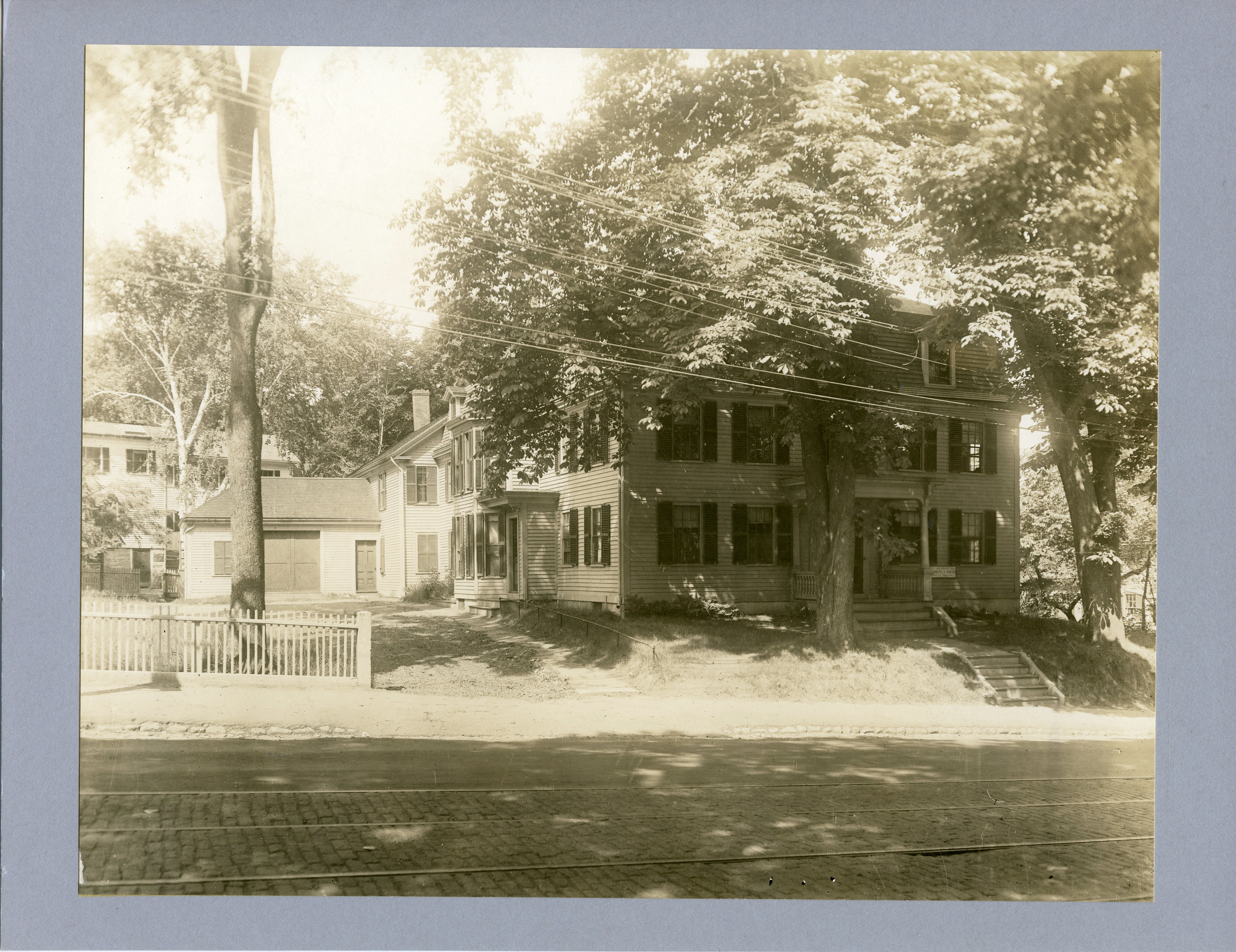 America House located at 147 Main Street and built in 1825 was originally called Blunt House. In 1832 Samuel F. Smith, a member of the class of 1834 of the Seminary wrote "America" and set the words to a German tune he had been translating for Lowell Mason, an instructor of his. It was also called the Clark House from 1908 to 1919. This view was taken after the completion of the trolley line. The driveway and the roard with its stone curbing are done.