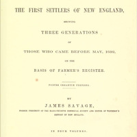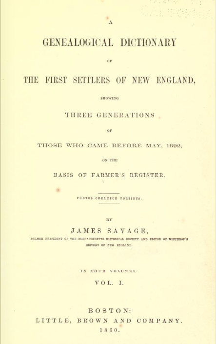 Genealogical Dictionary of the First Settlers of New England, showing three generations of those who came before May, 1692, on the basis of Farmer's Register. Vols 1-4.