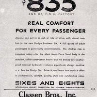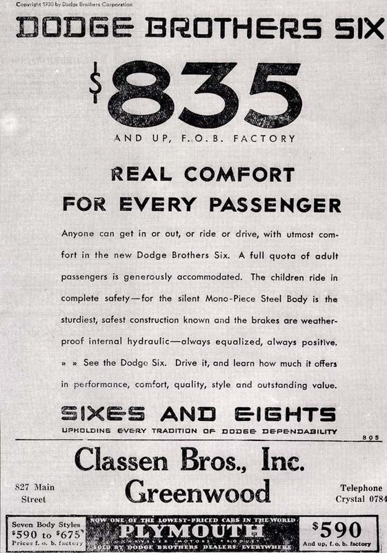 - "John and Horace Dodge started in the automotive industry by supplying engines and transmissions to R.E. Olds, later selling engines, transmissions, and axles to Henry Ford for his automobiles. By 1913 Ford started producing these parts and adapting them to their own machines, leading to the Dodge Brothers producing their own automobile that was high in quality and durability at an affordable price. In 1928, Walter P. Chrysler bought the company after the brothers' deaths. The 1930 Dodge DD Six Business Coupe, advertised by Classen Bros. Inc. of Greenwood, had a factory price of $835. Power was supplied from a 6-cylinder 189.8 cubic-inch engine that provided just over 60 horsepower. Classen Bros., Inc. was located at 827 Main Street in Greenwood, later renumbered as 1099 Main Street. The dealership, which also sold Plymouths as well as Goodyear tires and tubes, was established in 1921." - Text from calendar by Jayne M. D'Donofrio.