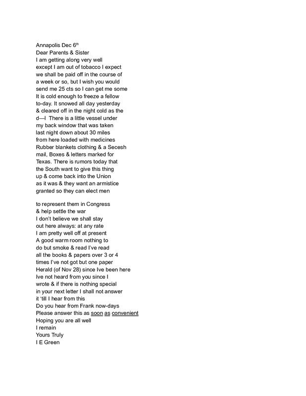 - A letter from Isaac Edward Green to his parents and sister, Lucinda.